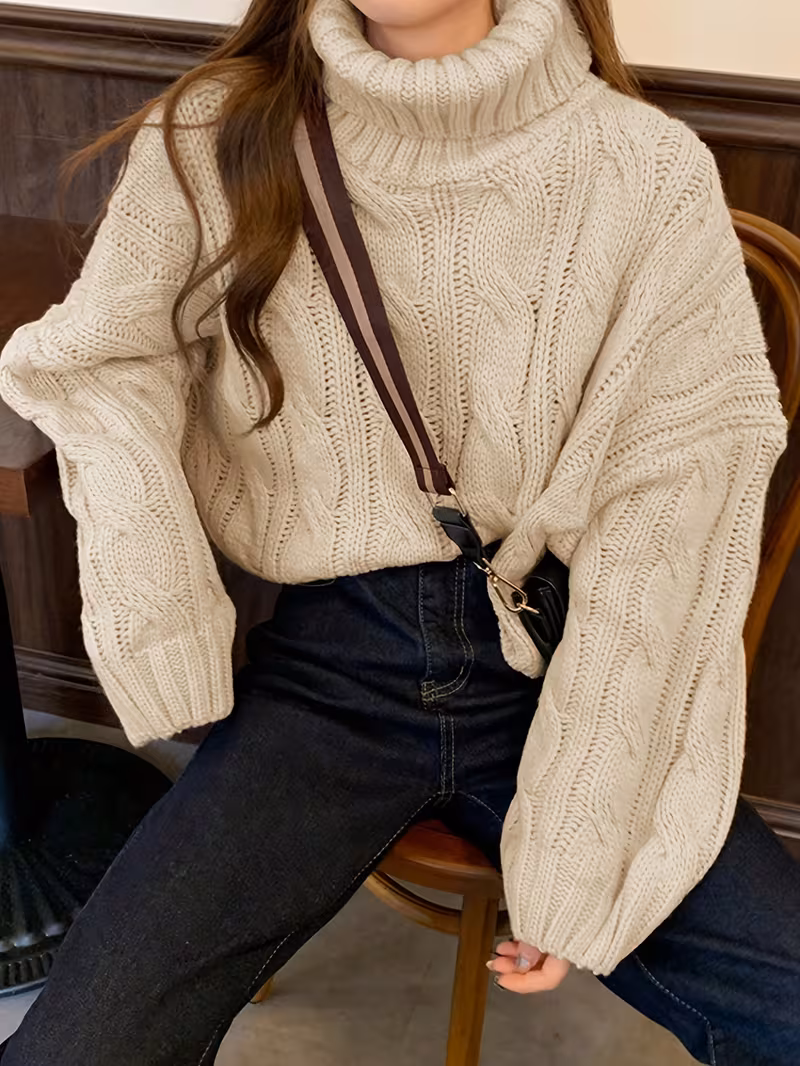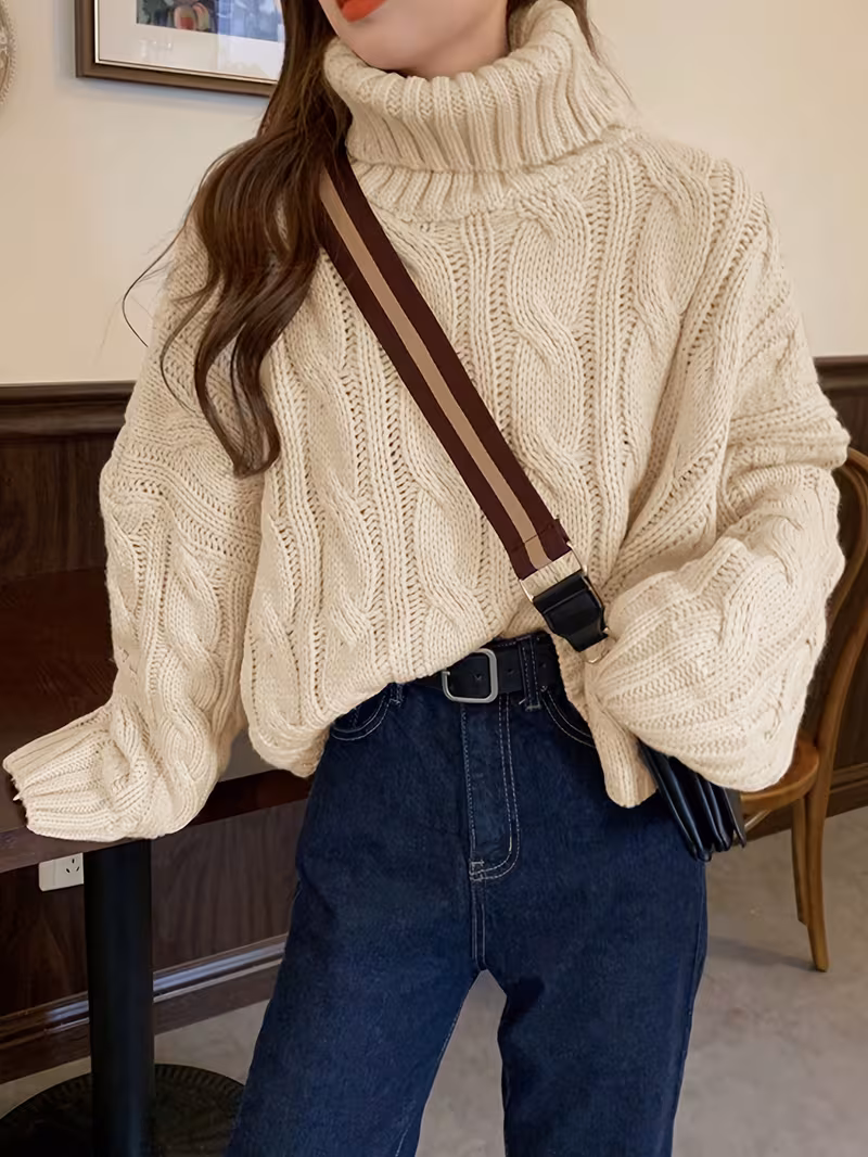 秋冬にぴったりの無地ハイネックケーブル編みニット。